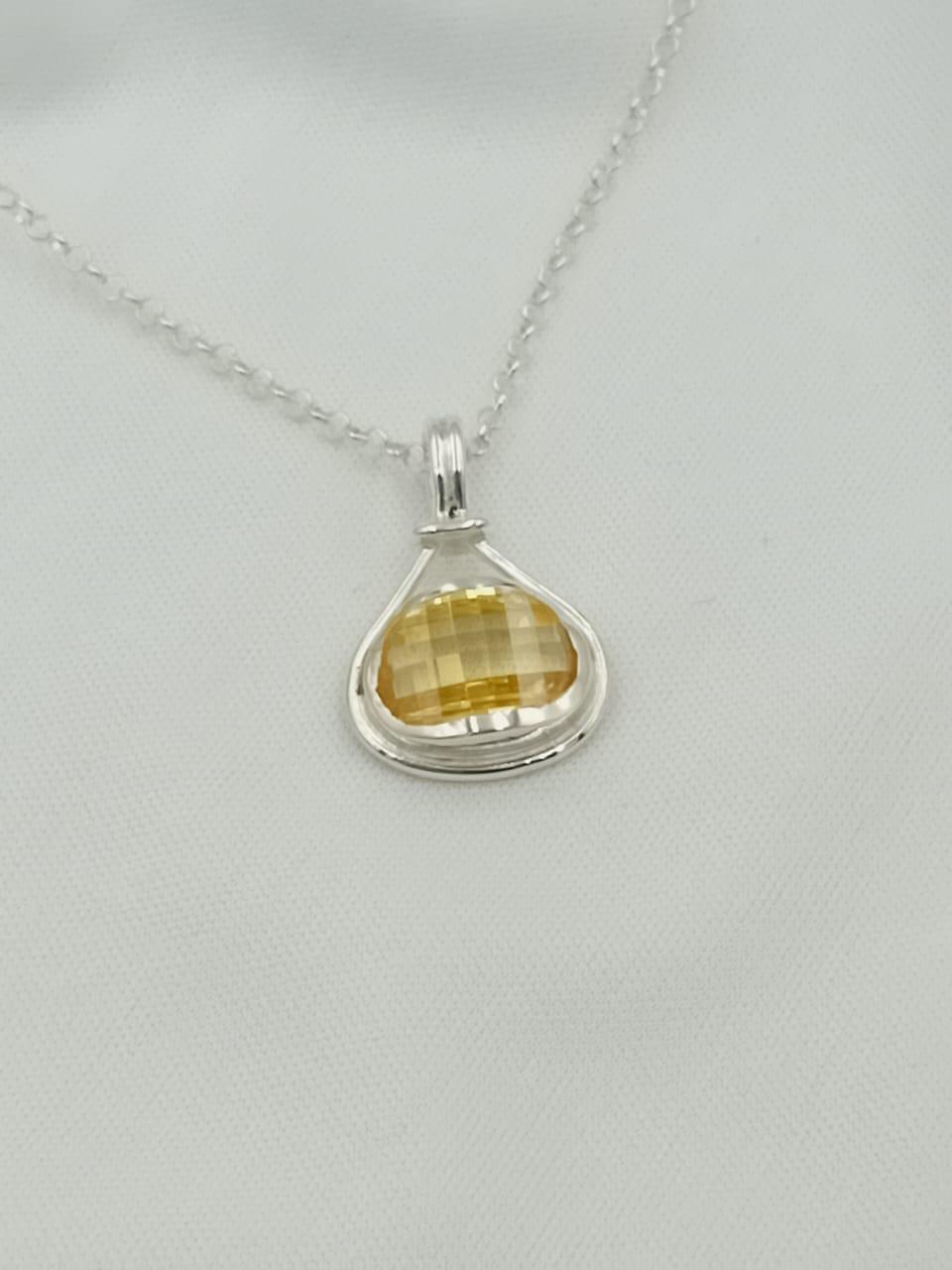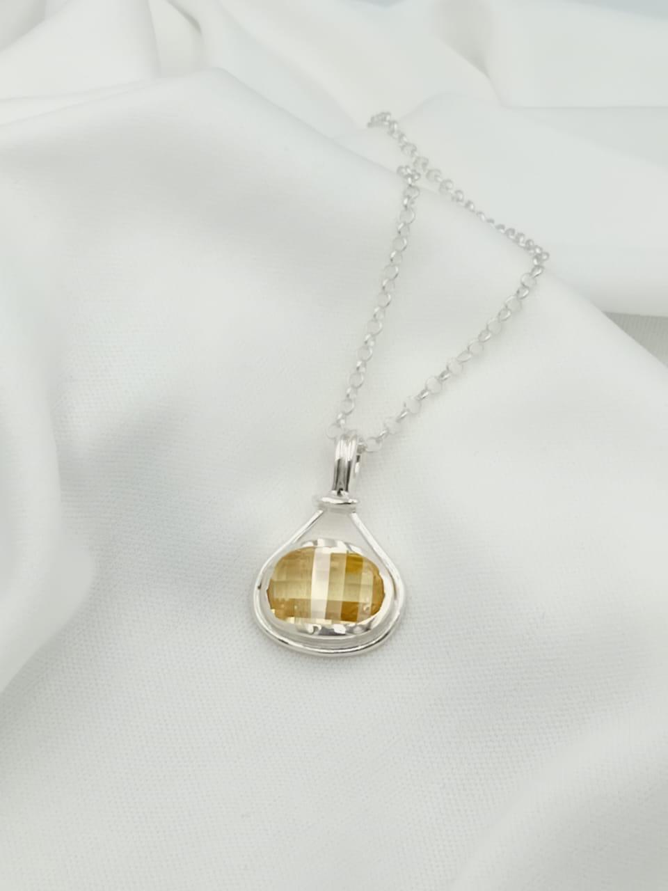 Este espectacular collar presenta un dije con una gema amarilla de corte facetado, cuya textura crea un hermoso juego de luz y reflejos. La piedra está montada en un marco de plata pulida, realzando su color vibrante y su diseño sofisticado